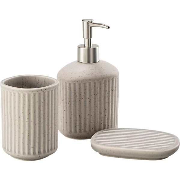 Découvrez Nans, un set de salle de bain prêt à l’emploi. Ce set est composé de trois accessoires de salle de bain indispensables à cette pièce. On retrouve tout d’abord le distributeur de savon liquide. Son bouton pressoir argenté se dévisse et vous permet de remplir le distributeur du produit de votre choix. Cela peut être du savon mais aussi tout type de cosmétique sous forme liquide, comme un démaquillant ou une eau micellaire. A côté, nous avons également un gobelet en céramiquepensé pour entreproser vos brosses à dent, ainsi qu’un porte-savon. Ensemble, ces trois accessoires de salle de bain forment un set harmonieux. Chaque pièce est créée au Portugal et arbore une belle robe beige mouchetée. La céramique a été minutieusement travaillée pour offrir cet aspect strié, apportant du volume à ces accessoires de salle de bain. Fonctionnel et décoratif, ce set apporte de la cohérence à votre salle d’eau.
