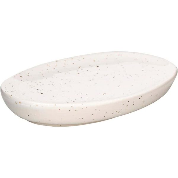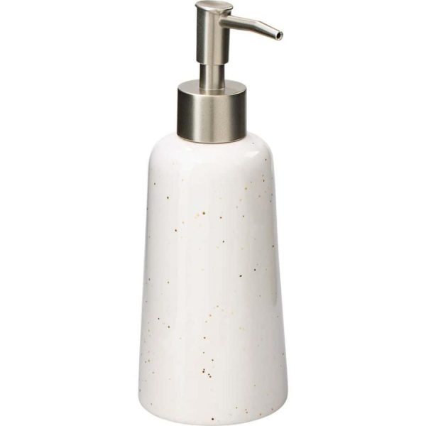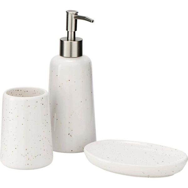 Ce set en céramique se compose des essentiels à avoir dans sa salle de bain. On retrouve tout d’abord le distributeur de savon liquide. D’une simple pression, il dose le savon liquide de votre choix pour vous laver les mains. A côté de lui, le porte-savon. De forme ovale, ce porte-savon en céramique permet d’accueillir un pain de savon. Enfin, ce set blanc est accompagné d’un gobelet afin de pouvoir ranger vos brosses à dents. Tous ces accessoires de salle de bain sont conçus au Portugal, fabriquant ancestral de céramique. La terre a été modelée, peinte puis vernis afin d’obtenir ce beau glacé brillant. Sur le blanc éclatant, un motif subtil : un moucheté de noir et de brun qui apportent de l’irrégularité et donc de l’authenticité à cet ensemble de salle de bain blanc.