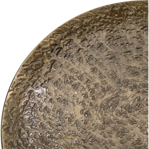 Cette petite coupe décorative est confectionnée en métal. Pour cet objet déco, le fer est fondu puis travaillé pour obtenir ce rendu faussement vieilli. En effet, Haifa a des allures de coupe ancienne grâce au martelement du métal. Ce dernier présente une surface hétérogène, faite d’aspérités. Ces irrégularités donnent de la texture mais aussi du charme à cette pièce. Cette petite coupe dorée de 20 cm de diamètre peut servir de viche-poche ou encore de rangement pour des bijoux.