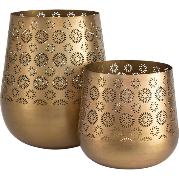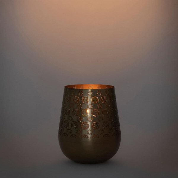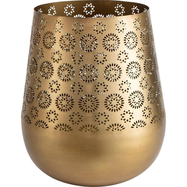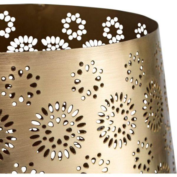 Ce photophore en métal doré affiche de belles proportions. De 25,5 cm de diamètre sur 30,5 cm de haut, il permet d’accueillir toutes vos bougies, mêmes les plus imposantes. Ce photophore doré présente un motif ajouré : de petites fleurs finement découpées dans le fer. Ainsi, ce photophore offre un jeu de lumière une fois la bougie allumée. Des zones d’ombre épousent les formes lumineuses pour un belle fresque visible une fois la nuit venue.
