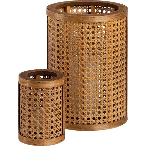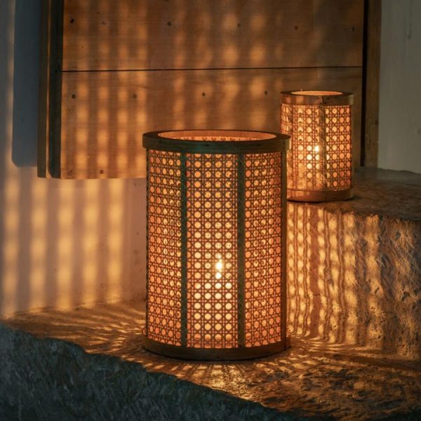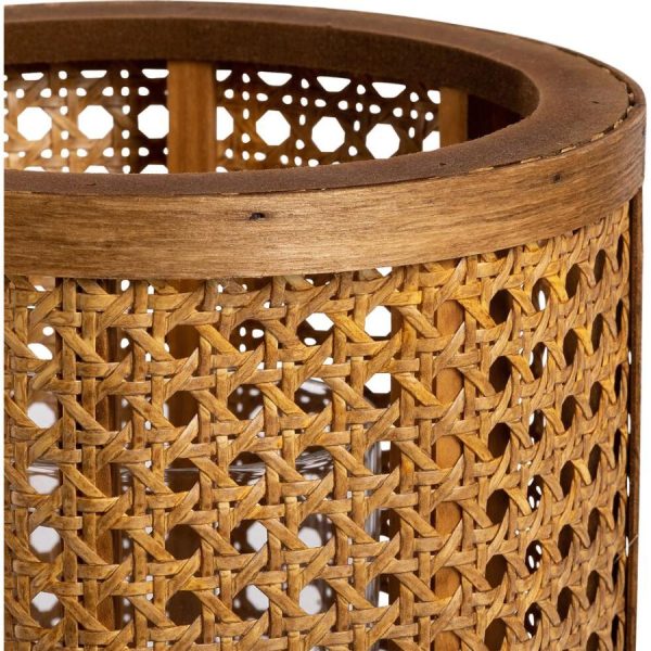Très en vogue dans les années 60, le cannage revient sur le devant de la scène, dans le mobilier mais aussi par touches subtiles en décoration. Le cannage revêt plusieurs personnalités selon le décors dans lequel il est intégré. Il s’associe aussi bien à un intérieur rétro de la Belle Epoque qu’au style colonial. Cette petite lanterne est largement inspirée de ce savoir-faire. Le tressage en fibres plastique est structuré par des finitions en bois de pin. En son sein, un photophore en verre transparent pour accueillir une bougie sans danger. Un élément de déco lumineux et exotique à intégrer chez vous, sur un meuble ou un chemin de table.