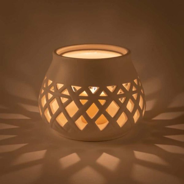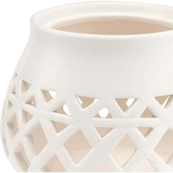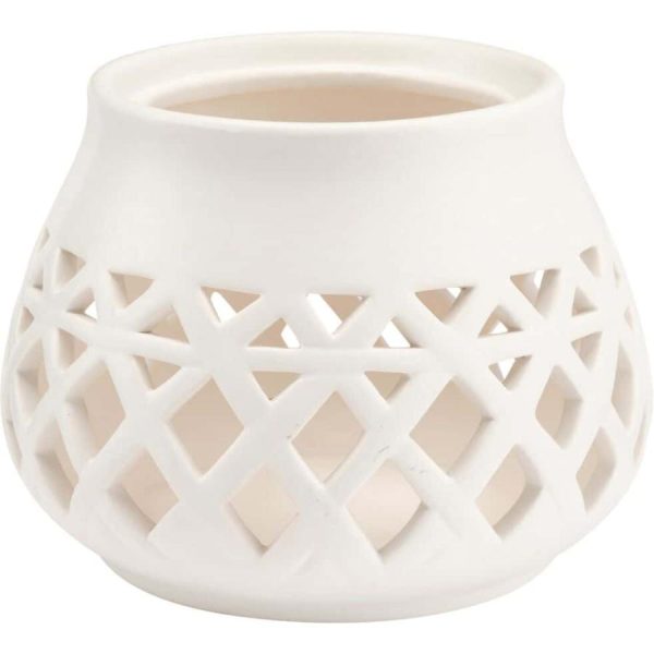 Ce petit photophore en céramique affiche une surface lisse, ajourée de quelques motifs géométriques. Triangles et losanges viennent ponctuer ce photophore blanc afin de laisser filtrer la lumière et offrir un motif lumineux du plus bel effet. Avec son ouverture de 7,5 cm, ce photophore ajouré accueille en son sein des bougies de taille moyenne. De jour comme de nuit, ce photophore en céramique blanche illumine votre décoration de sa nuance éclatante. Un objet déco parfait pour créer une atmosphère chaleureuse et tamisée.