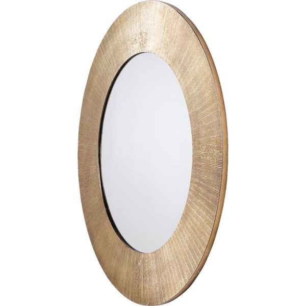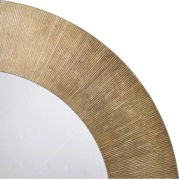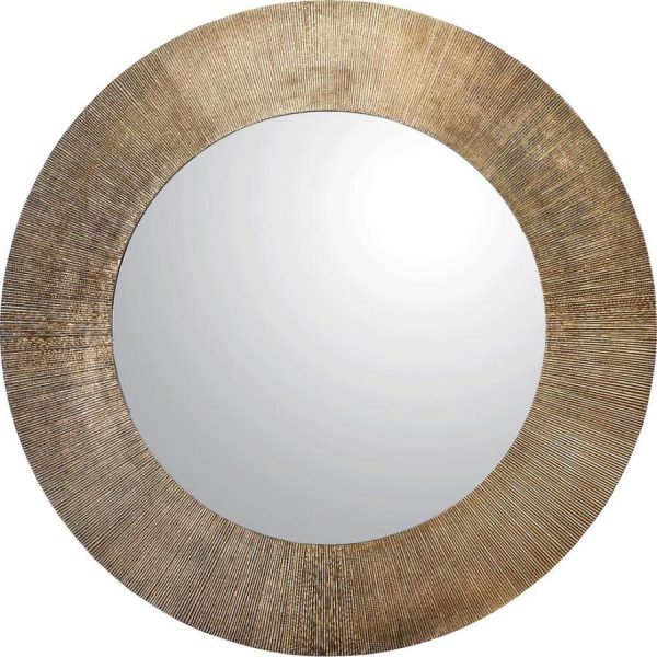 Ce grandmiroir rond se situe à la frontière entre le miroir soleil et le miroir baroque. Sur ses bords en métal doré, une myriade de petites stries. Cet aspect côtelé rappelle les rayons du soleil, grande tendance de l’été. Quant au doré à l’aspect vieilli, il donne tout le caractère à ce miroir métallique. Une pièce déco qui dégage une belle puissance et donne tout son cachet à la pièce. Pourquoi ne pas le détourner en miroir rond de salle de bain ? Un choix à la fois artistique et dynamique qui accrochera la lumière et la diffusera tout autour de lui. Ce grand miroir mural trouve également sa place dans un salon, une chambre ou une entrée pour agrandirvisuellement la pièce et l’exalter.