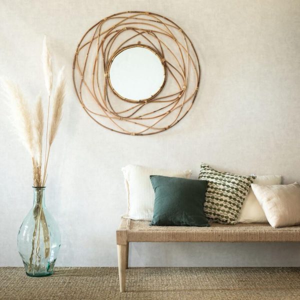 Tressé à la main au Vietnampar des familles d’artisans vivant de la vannerie, le miroir Lutea inspire et fascine. Les lianes de bananier, appelées kubu, s’entremêlent savamment pour obtenir une grosse rose à suspendre au mur. Les fines pétales se superposent subtilement pour obtenir cette fleur fraichement éclose. Non-teinté, ce miroir arbore une couleur naturelle qui attire la lumière et la réverbère chez vous. Ce grand miroir mural de 90cm de diamètre habille un pan de mur de ses délicates tiges pour une décoration ethnique ou encore bohème.