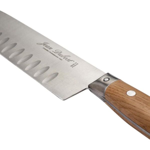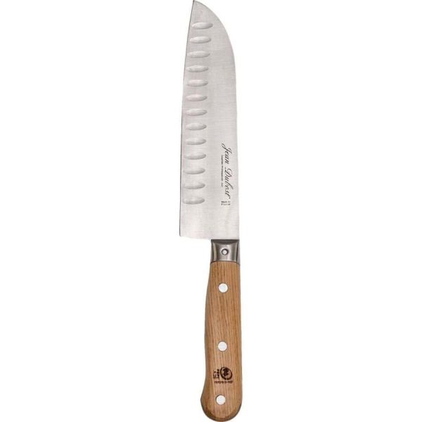 Ce couteau polyvalent possède trois vertus : découper, trancher, hacher. Inspiré de la cuisine japonaise, le couteau santoku vous assurera la découpe de vos poissons crus, et de vos légumes. Muni d’une lame alvéolée, pointue et incurvée à l’extrémité, il permet aux aliments de ne pas se coller. Le manche en bois de chêne certifié PEFC quant à lui apporte un aspect méditerranéen à votre cuisine grâce à son essence de bois naturelle
