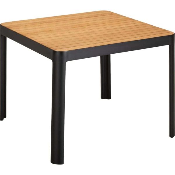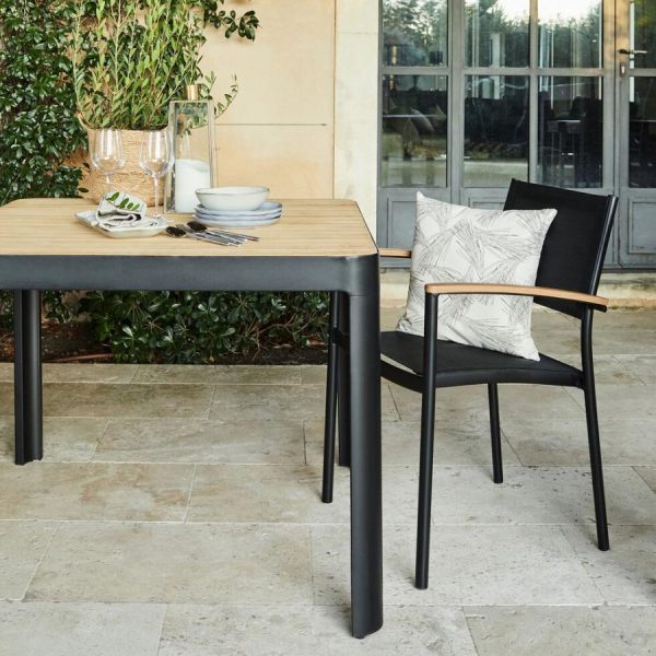 Chaises : Structure en aluminium fintion peinture époxy noir mat. Assise et dossier en PVC tissé noiraccoudoirs en eucalyptus FSCfinition teck.